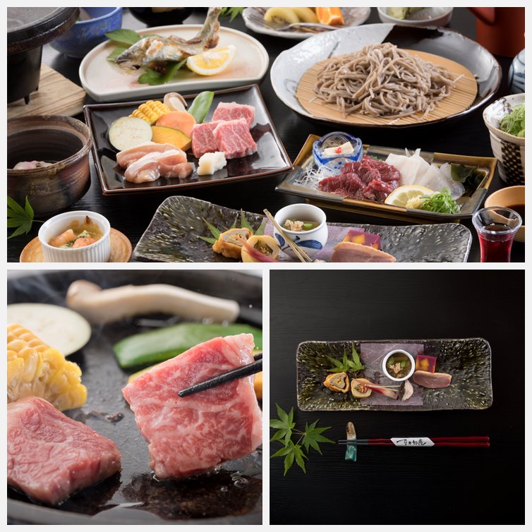 Kaiseki RyoriSeasonal banquet cuisine that allows you to fully enjoy the blessings of nature from the Kumamoto-Aso area. Our banquets provide a well-balanced blend of meat and fish, including brand-name beef from Aso, free-range chicken, “basashi” (horse-meat sashimi), a local specialty, as well as salt-grilled fresh river fish. As a final course, please be sure to enjoy our homemade soba noodles.